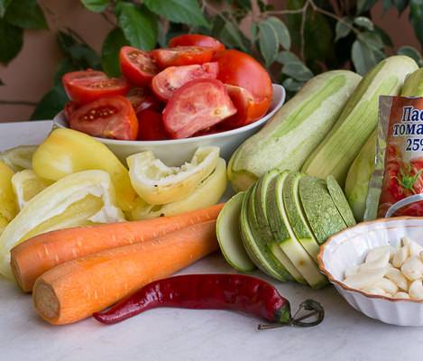 Bulgarian and hot peppers, garlic and tomatoes must be chopped using a meat grinder (you can use a blender). All vegetables, spices are put into a large saucepan or enamel bowl, the salad is thoroughly mixed.