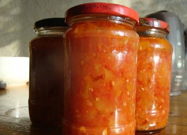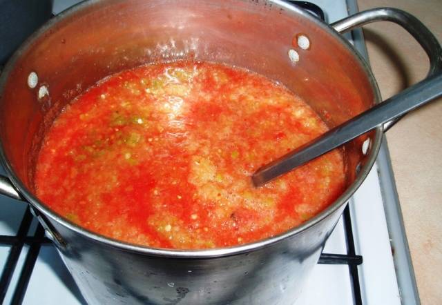 - Boil the tomato sauce, add all the chopped and chopped ingredients, two tablespoons of salt, half a glass of sugar, a little vegetable oil. Cook "Mother-in-law's tongue" over low heat for half an hour.