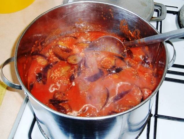 The settled eggplants are poured with a chopped mixture of vegetables, the resulting mass is mixed and put on fire. After boiling, the salad should be stewed for at least half an hour (it is necessary to cook "Mother-in-law's tongue" over very low heat).