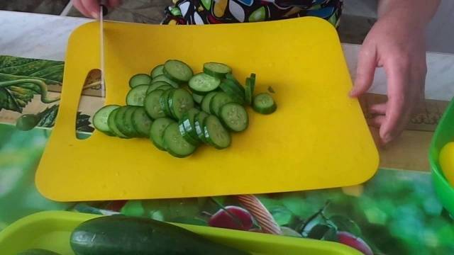 To prepare such "Mother-in-law's tongue" cucumbers are cut not in strips, but in circles. The thickness of the pieces should not be too large, but they should not be made thin either. Optimally, make circles 0.5-0.8 cm thick.