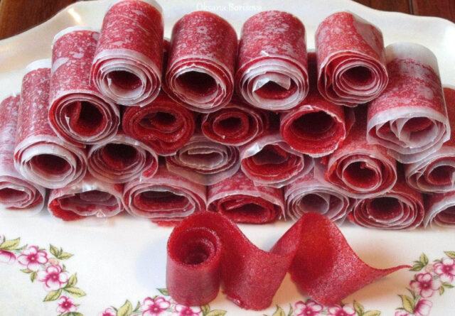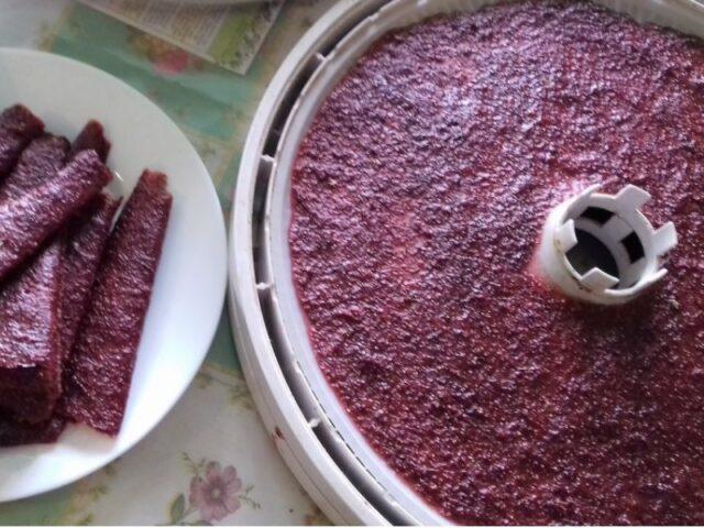 At the first stage, the berries must be crushed to a homogeneous consistency. This can be done with a blender, meat grinder and crush. Then the resulting mass should be spread out in a thin layer on a sheet of parchment and dried until tender.